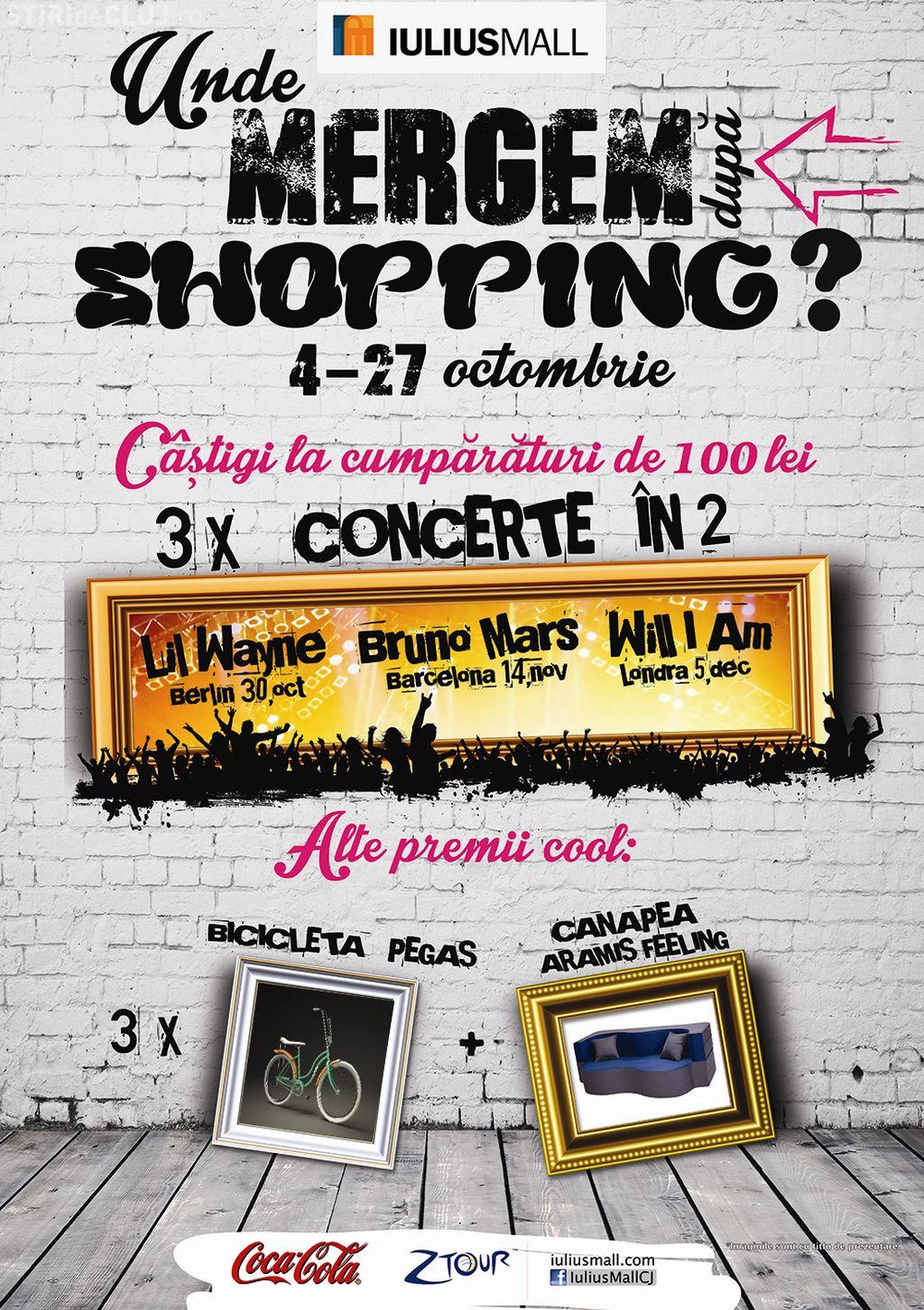 Toţi cei care fac cumpărături de minimum 100 de lei din magazinele preferate din Iulius Mall Cluj pot câştiga expediţiile muzicale mult râvnite. Sesiunile de cumpărături şi completarea taloanelor de participare la tombolă vor trimite trei norocoşi, alături de persoanele dragi lor, la concertele celor mai în vogă artişti: