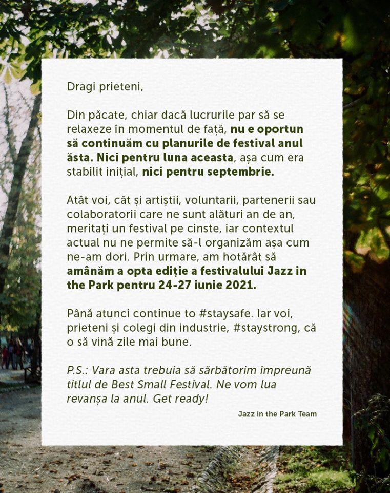 Mai precis, Jazz in the Park va avea loc în perioada 24 - 27 iunie 2021. ”Chiar dacă lucrurile par să se relaxeze în momentul de față, nu este oportun să continuăm cu planurile de festival anul ăsta. Nici pentru luna aceasta, așa cum era stabilit inițial, nici pentru septembrie”, anunță organizatorii.