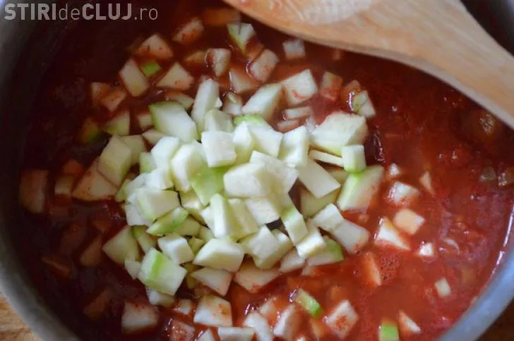 ”Maruntesti rosiile si le pui la fiert impreuna cu usturoiul si ceapa. Intre timp tai dovlecelul si il adaugi dupa ce scade sosul (aproximativ 10-15 minute). Il lasi la fiert, pui oregano, sare, 2 linguri de ulei de masline si la final cateva frunzulite de busuioc. Eu am plantat in ghiveci si iti recomand si tie sa incerci varianta asta. Separat, pui farfallele la fiert si in mai putin de 10 minute sunt gata. La final nu iti mai ramane decat sa aranjezi pastele in farfurie impreuna cu sosul si sa razi parmezanul peste”, a scris vedeta