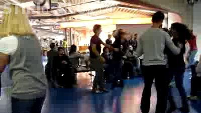 Un grup de tineri de la clubul Salsa Brillante din Cluj au oferit lectii gratuite de dans in aeroportul Tegel din Berlin, dupa ce au aflat ca zborul spre Budapesta intarzie.