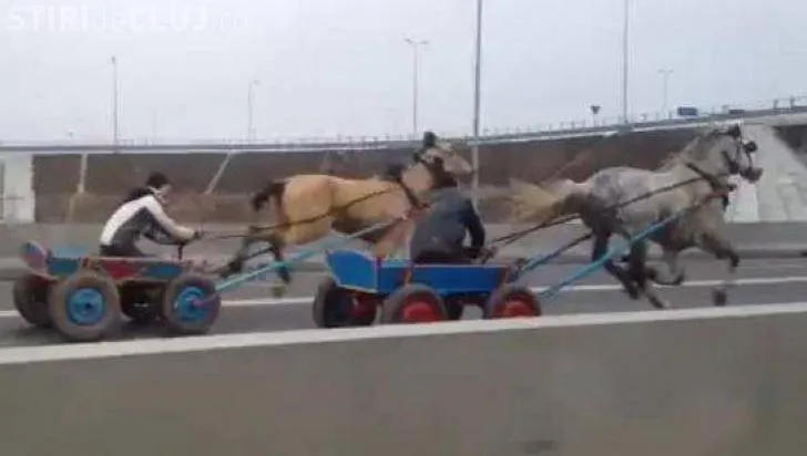 Doi căruțași din România fac senzație pe Internet, după ce au fost filmat în timp ce făceau o liniuță pe autostradă.