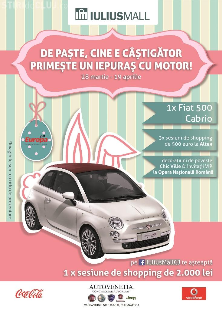 Pasionaţii de shopping pot participa la tombola dedicată Sărbătorilor Pascale, până la data de 19 aprilie. Toţi cei care fac cumpărături de minimum 100 de lei de la brandurile lor preferate au şansa să câştige cel mai râvnit premiu. Marele norocos al campaniei va deveni, în urma tragerii la sorţi, proprietarul unui autoturism Fiat 500 Cabrio.