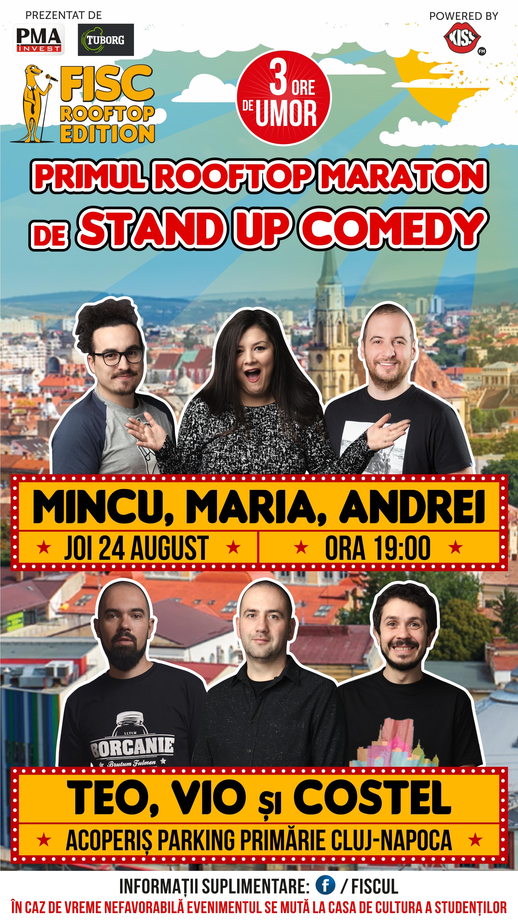 Evenimentul are loc în 24 august, iar șase dintre cei mai cunoscuți artiști de stand-up comedy de la noi din țară: Teo, Vio, Costel, Mincu, Maria Popovici și Andrei Ciobanu, îți dau întâlnire, timp de trei ore.