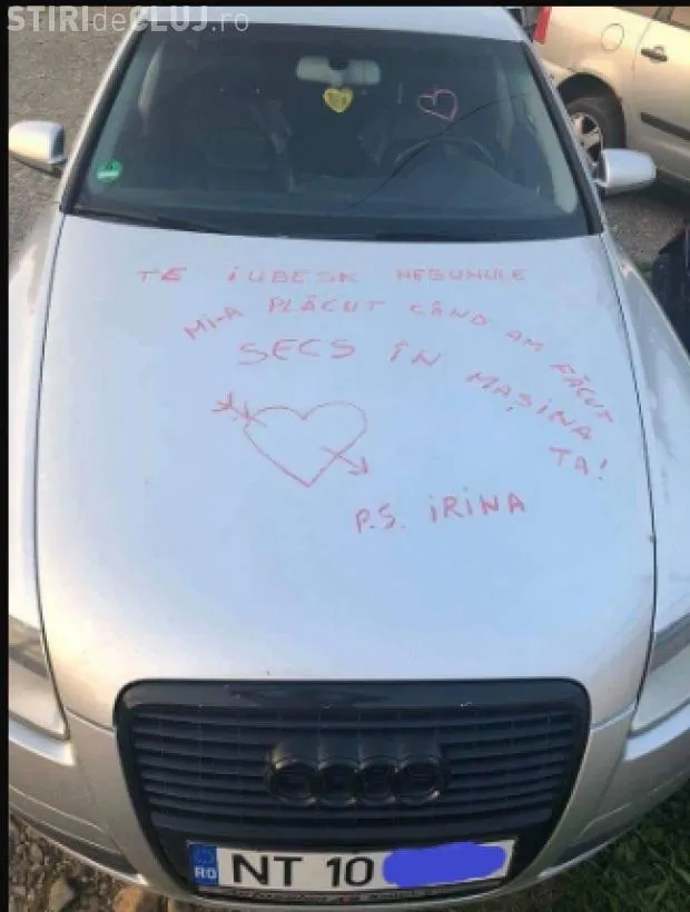 ”Te iubesk nebunule. Mi-a plăcut când am făcut secs în mașina ta! P.S. Irina”, i-a transmis înamorata pe toată capota mașinii, desenând și o inimioară, care să-i ilustreze și mai bine sentimentele.