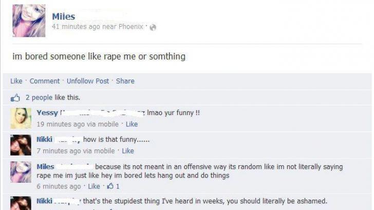 "Sunt plictisită, cineva să mă violeze sau ceva de genul ăsta", scrie fata, identificată drept "Miles" pe Facebook.