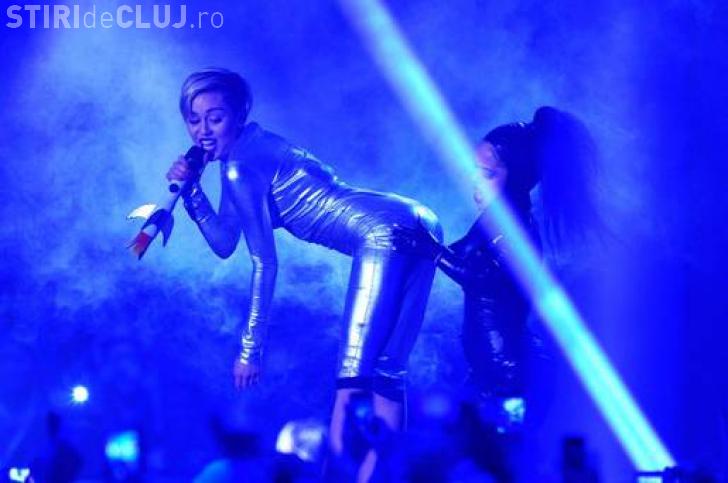Miley Cyrus a dansat senzual pe scenă alături de o femeie pitică, pe care a lăsat-o să o lovească peste posterior. Ea și-a aprins și o țigară cu foi, despre care Daily Mail scrie că ar fi fost vorba despre o ţigară cu marijuana.