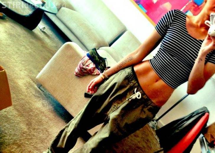 Artista a postat o fotografie în care poartă o pereche de jeans a iubitului său şi o bluză cu dungi, lăsând să i se vadă abdomenul extrem de subțire.