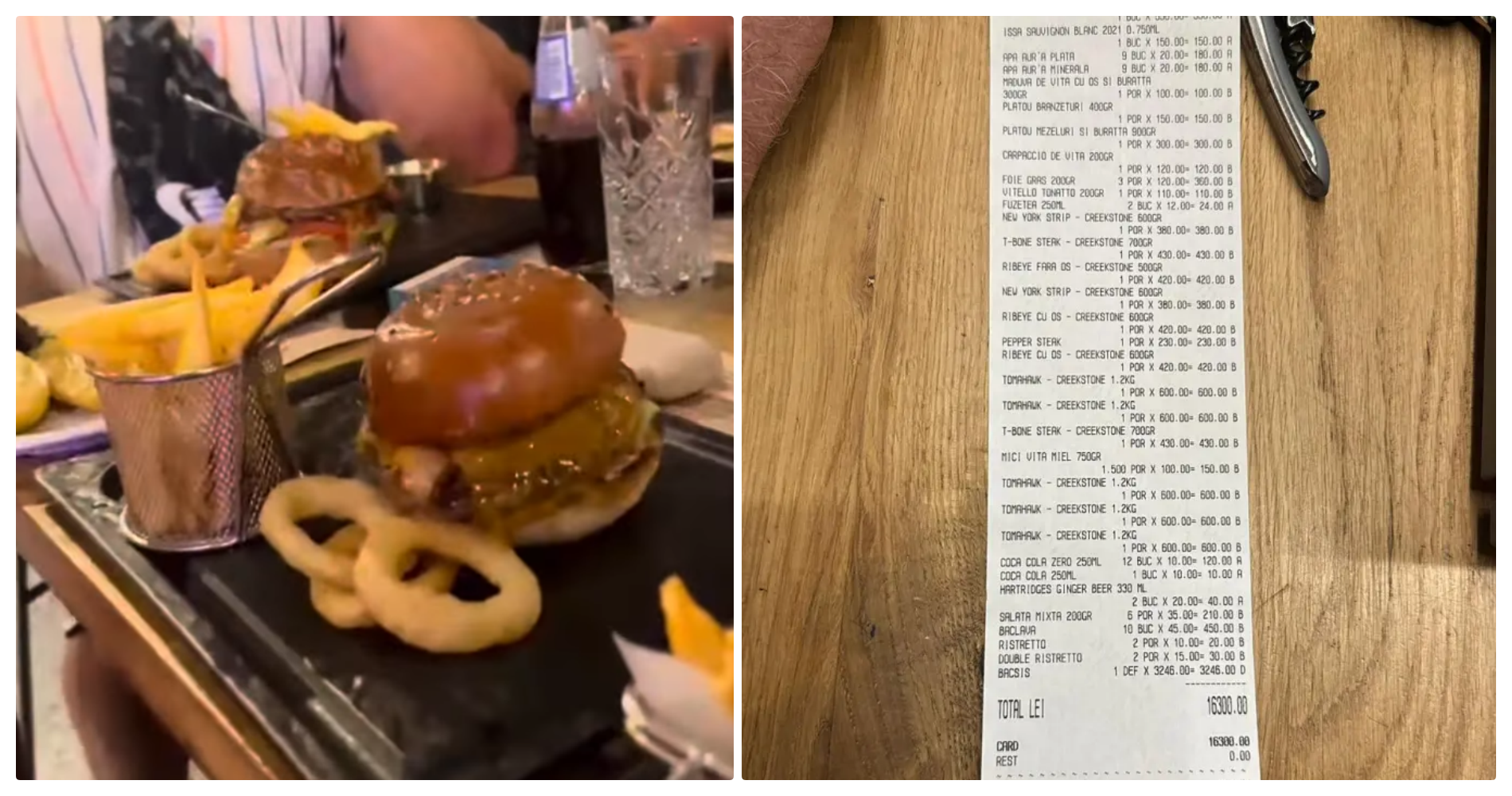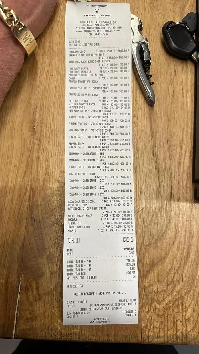 Notă de plată de 16.300 de lei la un restaurant din Cluj-Napoca. Bacșișul a fost 3000 de lei - FOTO
