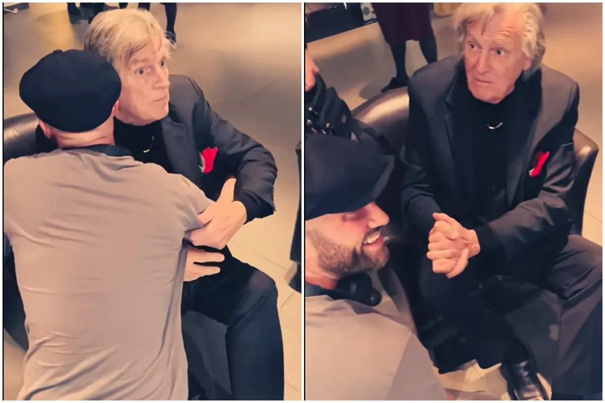 „Nu-mi vine să cred, tu vii să-mi pupi mâna?" - Maestrul Florin Piersic, vizibil emoționat de întâlnirea cu Bendeac, care a căzut în genunchi în fața sa
