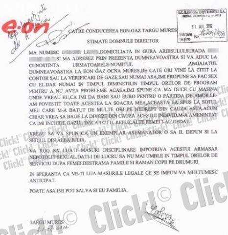 Sesizarea a fost înregistrată la E-ON Gaz Târgu Mureş în 31 iulie 2012. ”De câte ori vine la citit la contor sau la verificări de gaze, îmi propune să fac sex cu el. Dar numai în timpul dimineţii, în timpul orelor de program pentru a nu avea probleme acasă. Îmi spune că mă duce cu maşina unde vreau eu, că îmi dă bani sau euro pentru o partidă de amor”, a scris femeia în sesizarea, scrie Click.ro.