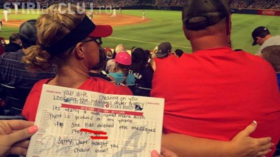 O femeie îi scria amantului mesaje, în timp ce era cu soțul pe stadion. Spectatorii i-au citit mesajele și au UMILIT-O