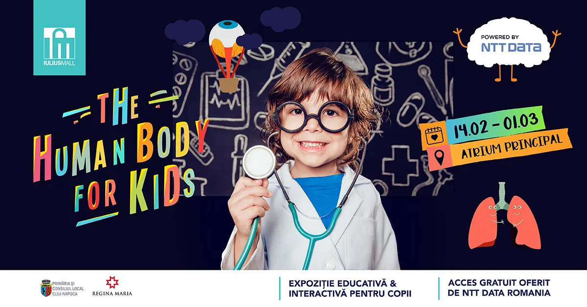 „The Human Body for Kids” este o expoziție interactivă și educativă, special concepută pentru cei mici, în care aceștia sunt încurajați să atingă, să se joace, să pună întrebări, să exploreze și să învețe despre corpul uman printr-o aventură extraordinară. Evenimentul va avea loc în perioada 14 februarie – 1 martie 2020, în zona Atrium, la Iulius Mall Cluj.