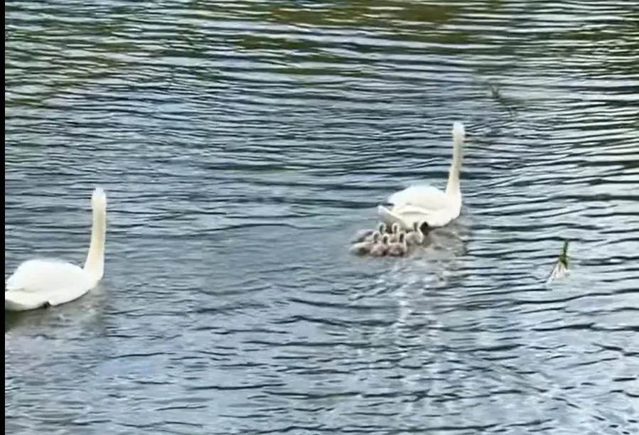 Imaginea este una de o drăgălășenie incredibilă: puii pufoși, încă nesiguri pe ei, înoată aproape de mamă, în timp ce tatăl patrulează vigilent perimetrul. Curioșii care s-au nimerit în zonă au putut surprinde scene rare, aproape cinematografice – un moment de tandrețe, dar și de protecție naturală exemplară.