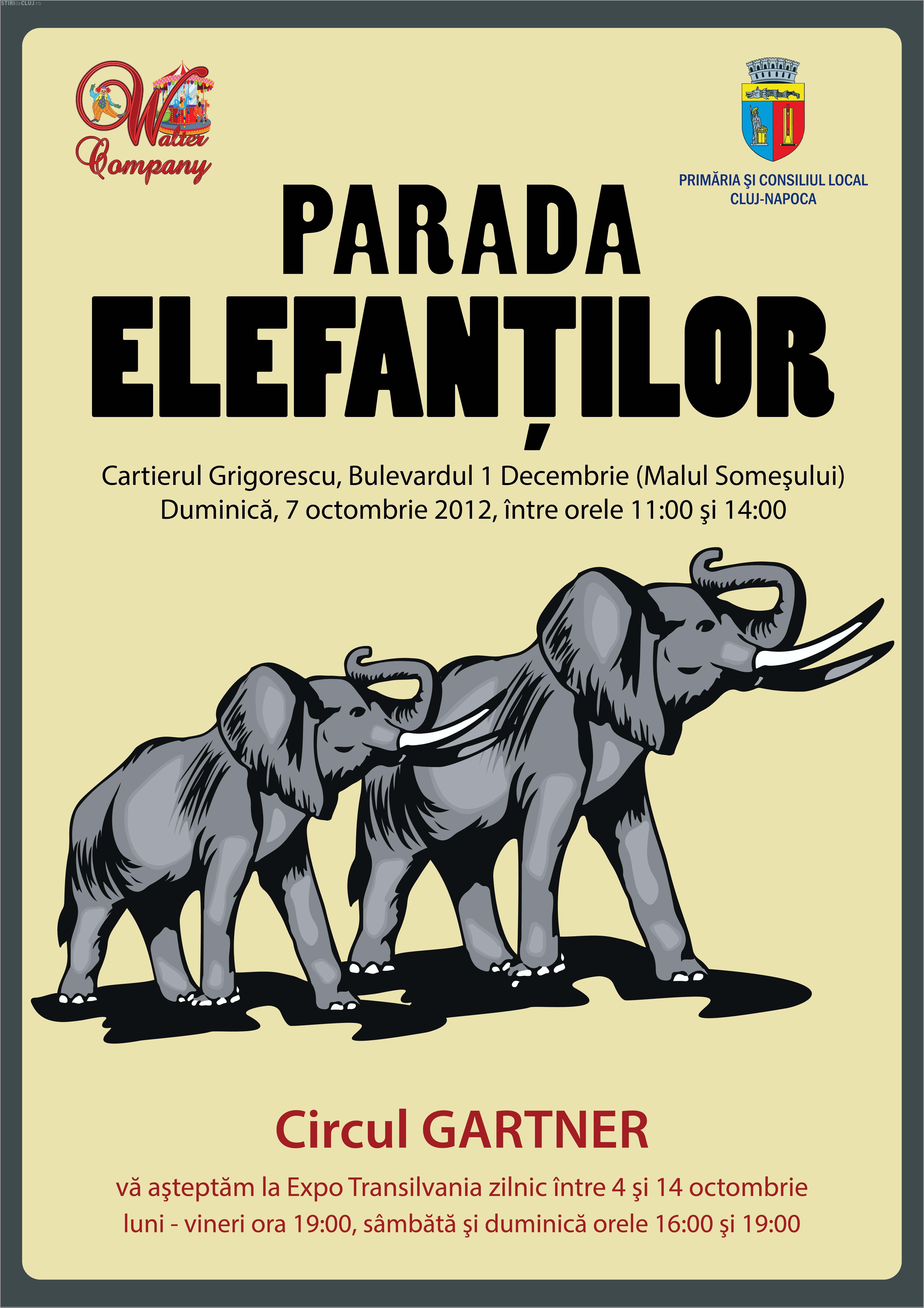 Primăria municipiului Cluj-Napoca a aprobat organizarea unei parade cu elefanţi duminică, 7 octombrie, între orele 11.00 - 14.00. Traseul paradei va fi de-a lungul Someşului.