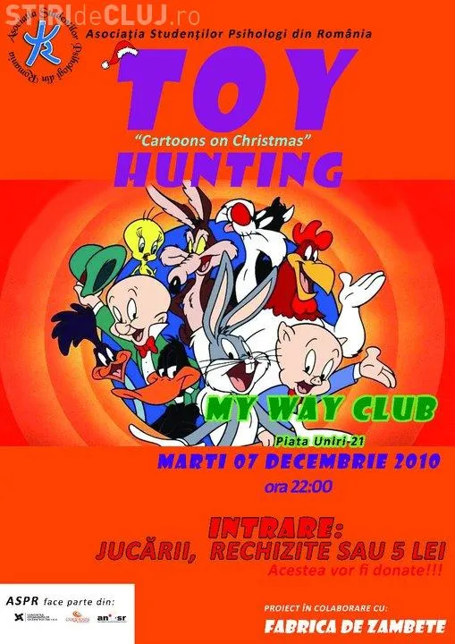 Asociatia Studentilor Psihologi din Romania, filiala Cluj-Napoca, organizeaza in 7 decembrie in clubul My Way o petrecere cu scop caritabil. Intrarea la petrecere se va face in schimbul unei jucarii, rechizite sau cinci lei. Bunurile obtinute astfel vor fi donate unor orfelinate.