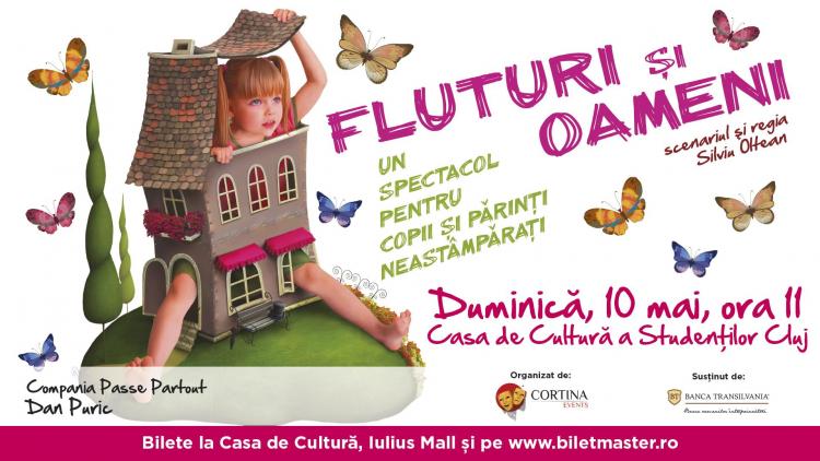 Cortina Events organizează duminică, 10 mai 2015, de la ora 11.00 un spectacol de teatru pentru copii şi părinţi neastâmpăraţi, şi anume “Fluturi şi oameni”,la Casa de Cultură a Studenţilor Cluj-Napoca.