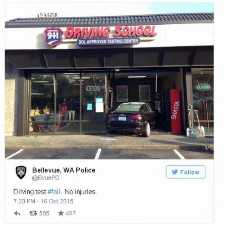 ”Din păcate, aceasta a încurcat pedala de acceleraţie cu cea de frână şi a intrat cu maşina în clădire”, a explicat un poliţist din Bellevue, Washington, pentru New York Daily News. ”Se descurca foarte bine iniţial, dar a intrat într-o vitrină, deci a picat testul”, a mai spus acesta.