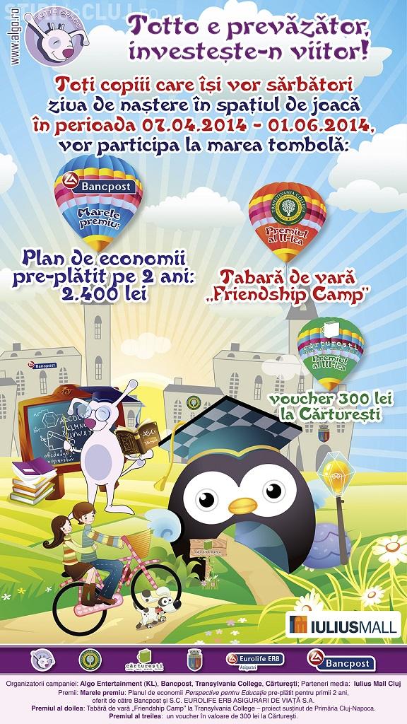Părinţii grijulii sunt bucuroşi să îşi aducă copiii la KidsLand, unde se desfăşoară campania „Totto e prevăzător, investeşte-n viitor!”. Până pe 1 iunie 2014, toţi ştrengarii care îşi sărbătoresc ziua de naştere în spaţiul de joacă KidsLand vor participa la marea tombolă a fericirii.