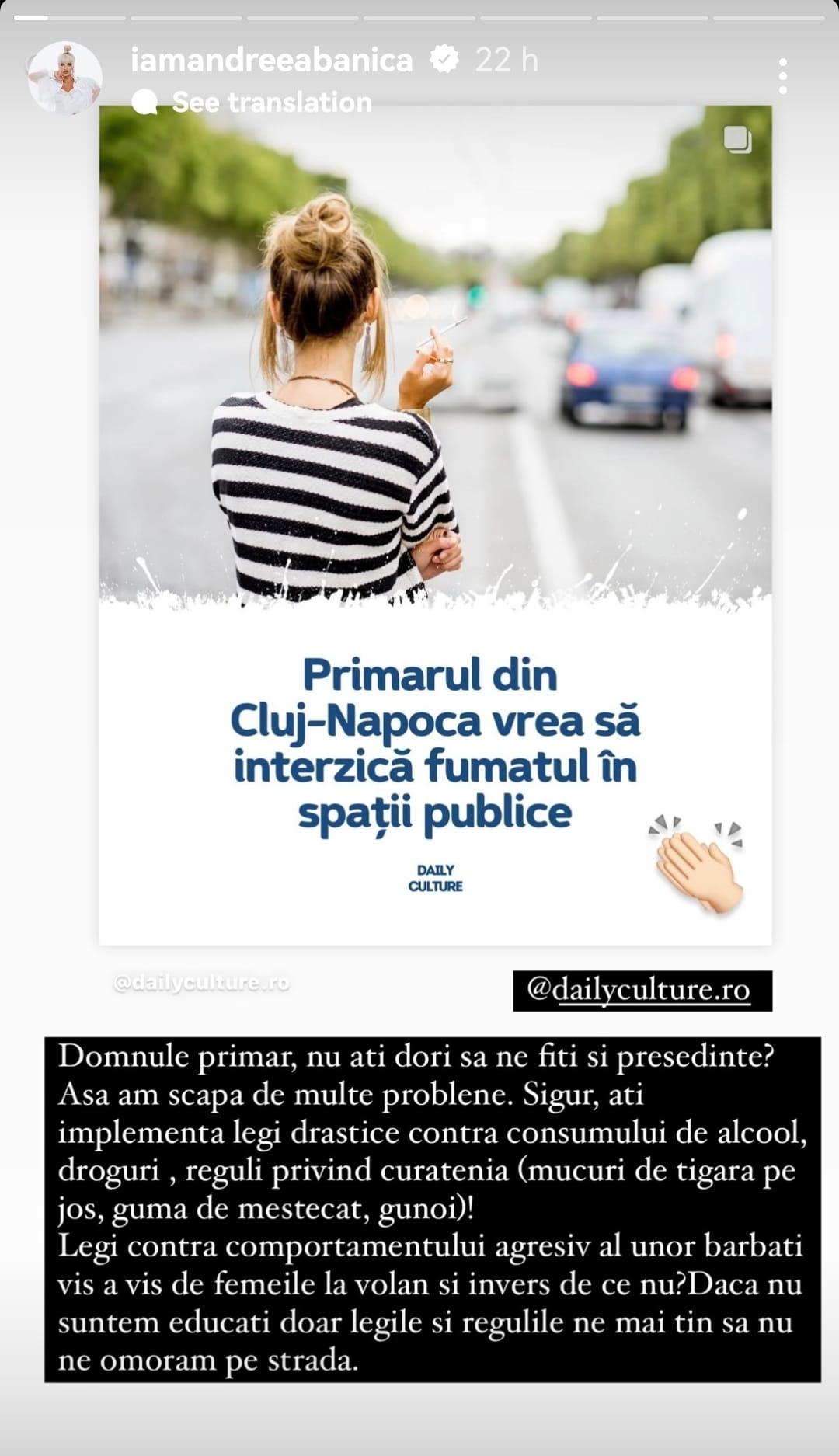 Andreea Bănică, încântată de inițiativa de interzicere a fumatului în spațiile publice din Cluj, consideră că primarul Emil Boc ar fi un bun președinte al României. Artista a reacționat pozitiv la posibilitatea ca Cluj-Napoca să devină primul oraș din țară care interzice fumatul în aer liber în anumite zone publice.