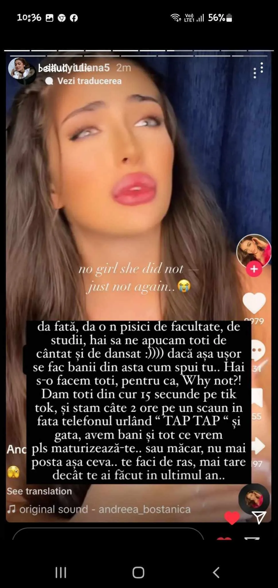 ”Toată România și Moldova vorbește că Andreea Bostanica a luat 4 la BAC. Dar am venit aici să vă spun că îmi pare foarte rău să vă dezamăgesc. Cu ajutorul lui Dumnezeu chiar al luat BAC -ul. Pe mine chiar nu mă afectează că am luat 7 la română. Gândindu-mă că dacă nu l-aș fi dat, viața mea nu s-ar fi schimbat absolut deloc. Faptul că nu aș fi dat BAC-ul nu mă încurca să fiu la fel de fericită, să îmi permit orice vacanță, să îmi permit orice haine, pantofii pe care îi vreau, mașina visurilor mele, brățări, ceasuri.