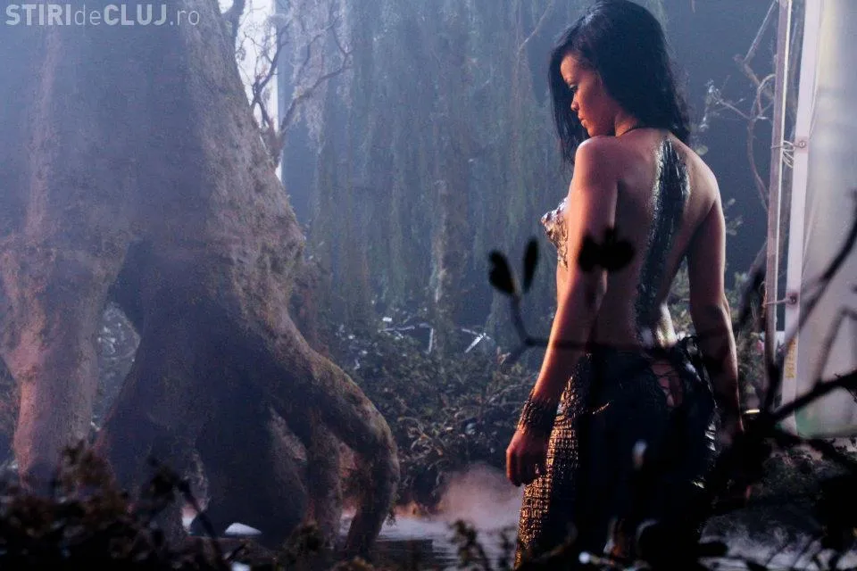 Rihanna are bustul acoperit cu un machiaj, pe post de costum.