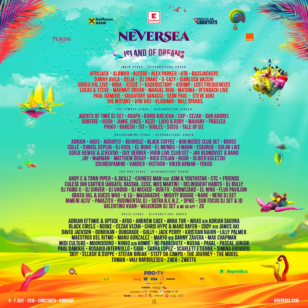 În cele 4 zile de festival, la cea de-a treia ediție NEVERSEA, vor fi prezenți peste 150 dintre cei mai buni artiști din străinătate și din țară. Programul festivalului, pentru fiecare zi, va fi disponibil pe neversea.com, începând de vineri, 14 iunie 2019.