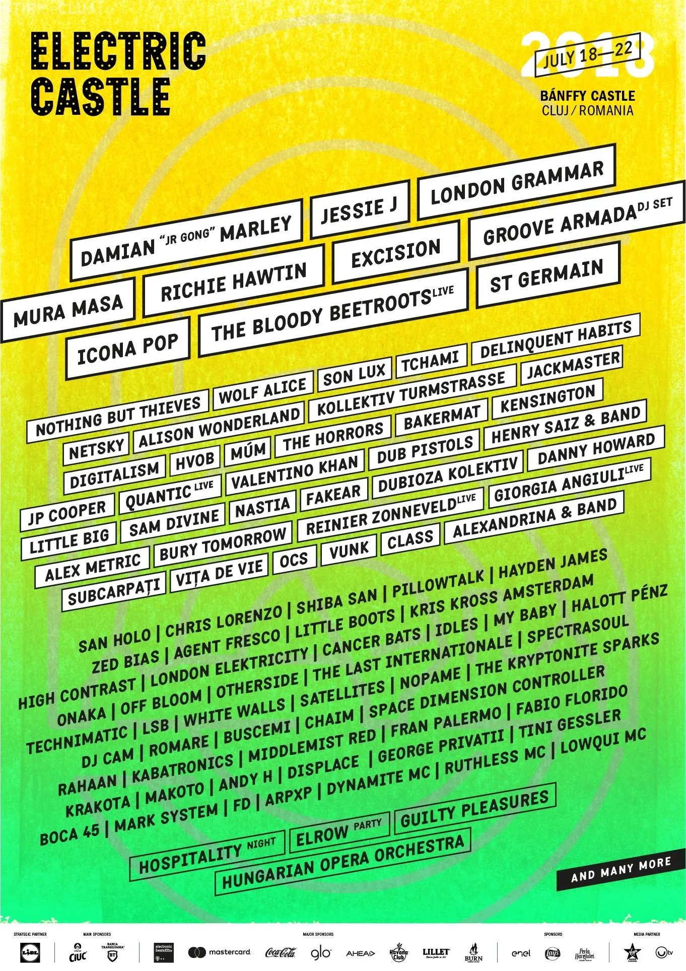 Pentru cei care vor să trăiască experiența Electric Castle din prima clipă, Damian Robert Nesta „Jr. Gong" Marley, cel mai tânăr fiu al legendei muzicii reggae, Bob Marley, le dă întâlnire din prima seară a festivalului. Pentru cei suficienți de curajoși să-și recunoască propriile „plăceri vinovate” la capitolul muzical, organizatorii au pregătit în acest an o petrecere dedicată: „Guilty pleasures”, un show în care vom reasculta (sau descoperi pentru prima dată) hit-uri ale anilor ’90 semnate de Vunk și Class.