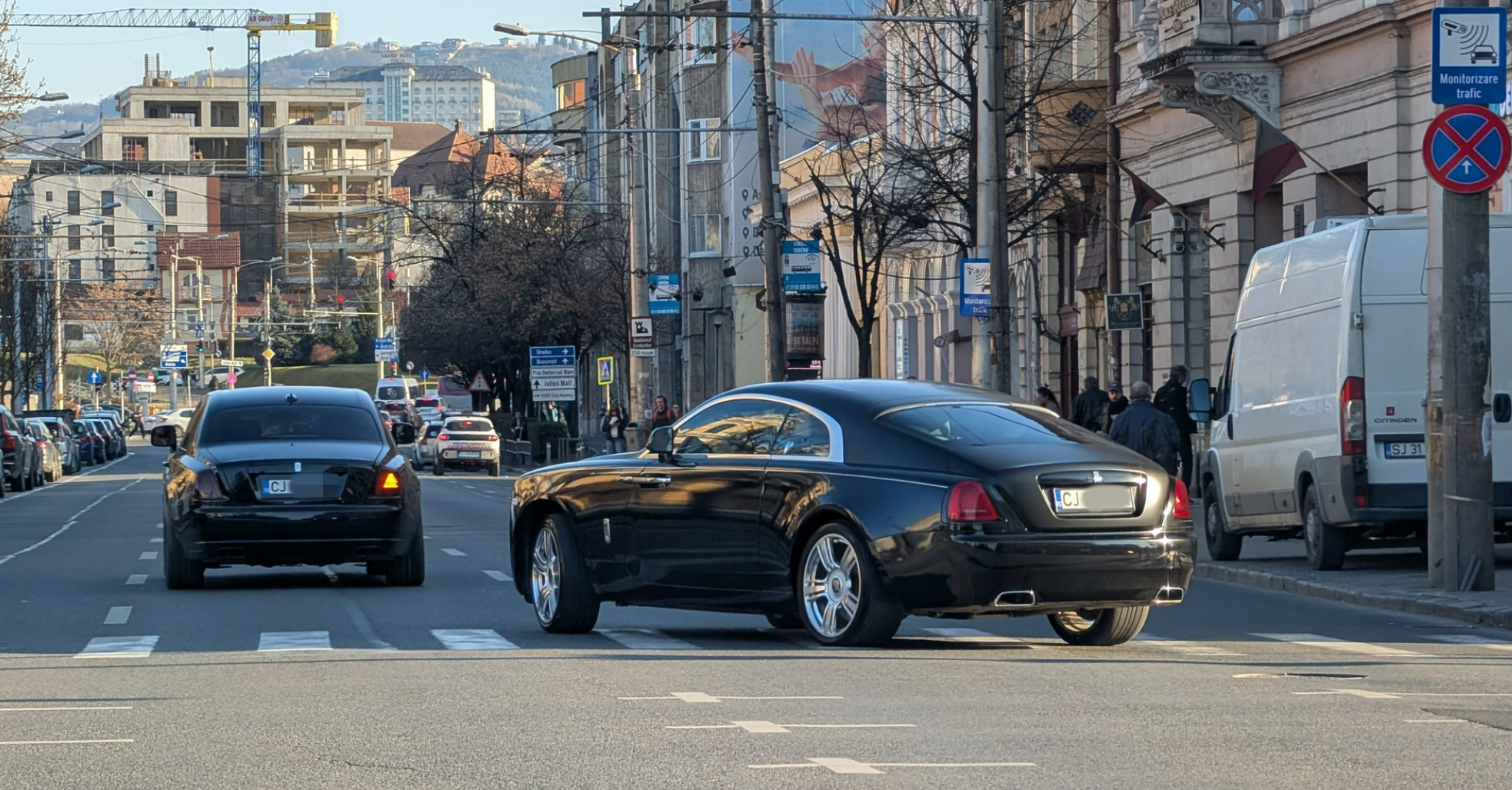 Două Rolls-Royce Wraith au fost surprinse rulând unul după altul pe stradă în centrul Clujului, lângă Teatrul Național.