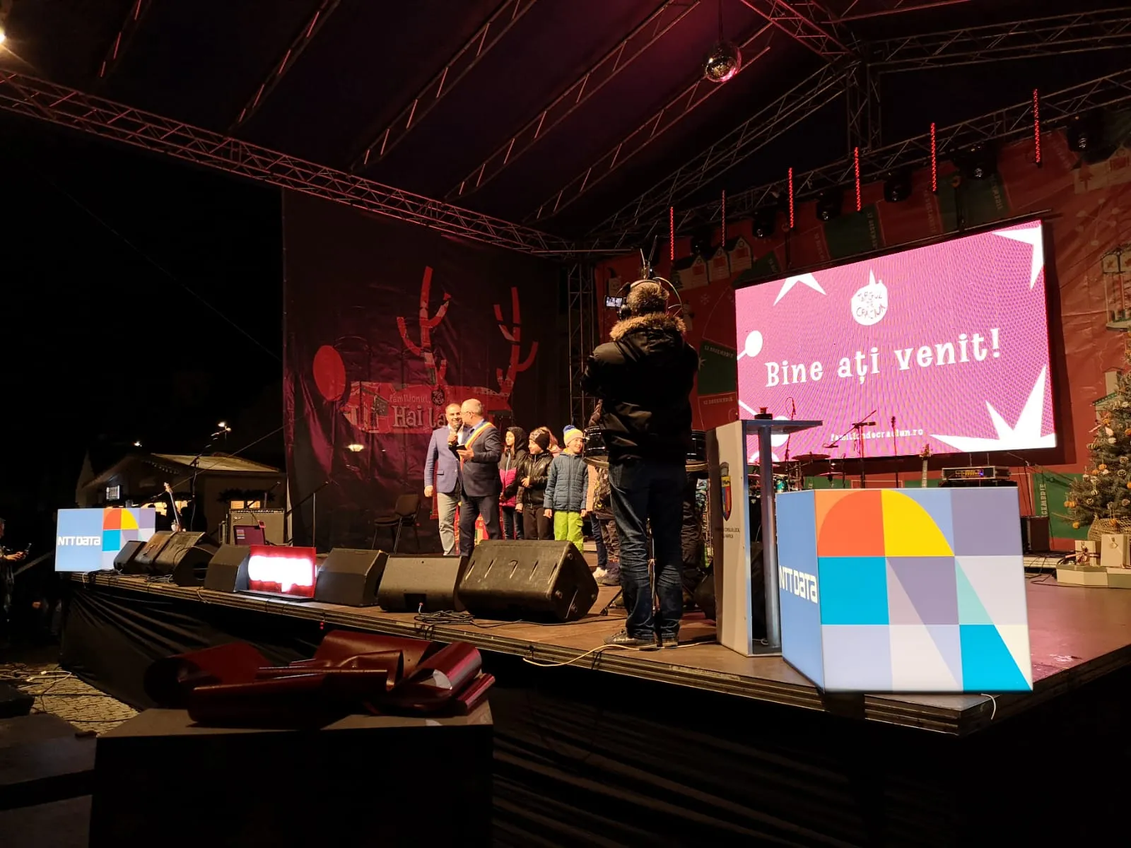 Primarul Emil Boc a urcat pe scenă şi a aprins luminiţele de Crăciun de pe o aplicaţie a telefonului mobil. Acesta a fost înconjurat de un grup de copii.