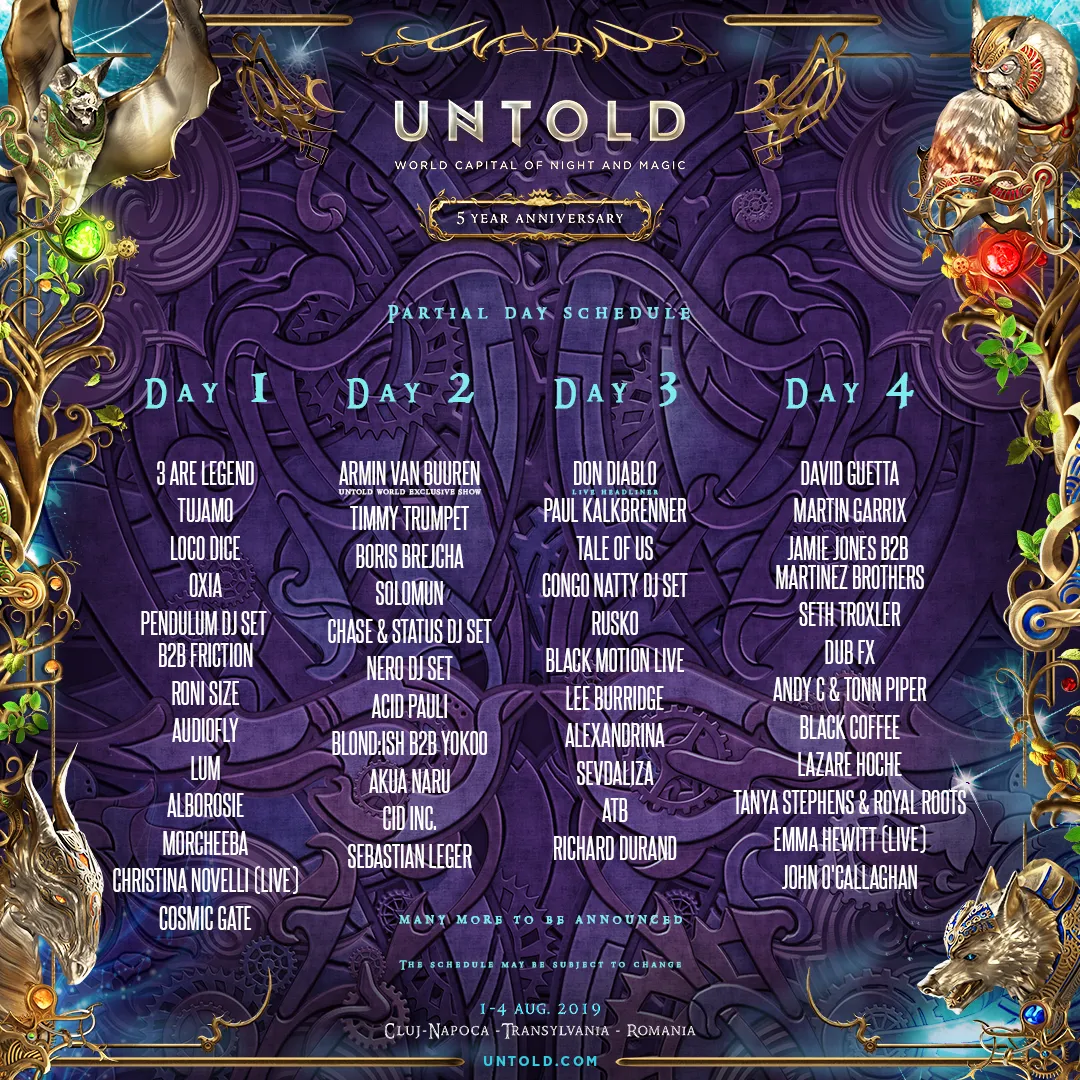 Fiecare ediție a festivalului UNTOLD a dezvăluit până acum câte un nou capitol din povestea nespusă a Tărâmului Nopții și Magiei. Legenda spune că doar cei care cred în magie văd cu adevărat lumea și îi înțeleg în totalitate misterele. De-a lungul celor 4 ani de UNTOLD, fanii festivalului au parcurs mai multe probe inițiatice la finalul cărora au reușit să privească lumea diferit. Au trăit aventuri fantastice și, fie că au realizat sau nu, fiecare dintre ei a simțit și a trăit magia, în diverse forme. Anul acesta, odată cu aniversarea a 5 ani de UNTOLD, fanii festivalului vor asista la ceva cu adevărat extraordinar - dezvăluirea unui secret bine păstrat, poarta către o lume a cunoașterii nelimitate. Ediția aniversară din acest an va aduna, pentru o celebrare de neuitat, toate personajele cu care fanii festivalului au făcut cunoștință în toți acești ani: Magicianul, Dragonul, Regele Războinic, Preoteasa Înțelepciunii, Bufnițele, Zânele și toate viețuitoarele magice care trăiesc în acest tărâm.