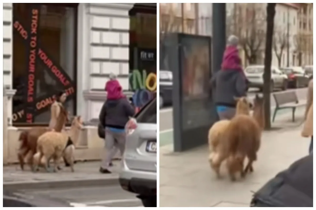 Să vezi și să nu crezi! Plimbare EXOTICĂ pe străzile din Cluj-Napoca. Clujenii au împărțit trotuarul cu două alpaca VIDEO