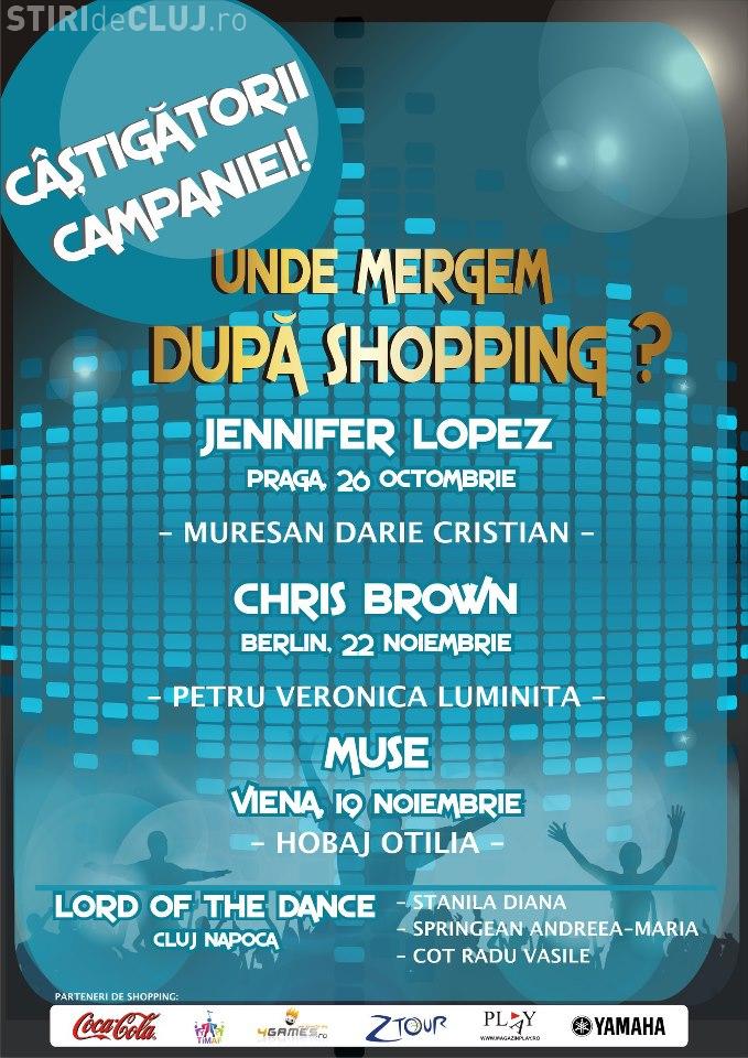 ”Şase clujeni care au făcut cumpărături de minimum 100 de lei au câştigat expediţiile muzicale mult râvnite. O sesiune de shopping şi completarea talonului de participare la tombolă s-au materializat în bilete pentru două persoane la concertul Jennifer Lopez, organizat pe 26 octombrie, la Praga, pentru Darie Cristian Mureşan. Aceeaşi reţetă de succes a ajutat-o pe Veronica Luminiţa Petru să câştige bilete la concertul Chris Brown, din 22 noiembrie, la Berlin. Câştigătoarea biletelor la concertul Muse, din 19 noiembrie, la Viena, este Otilia Hobaj. Pentru clienţii Iulius Mall trimişi la concerte din Europa, premiile se vor extinde într-o expediţie muzicală, fiindu-le asigurată cazarea şi transportul cu avionul pentru două persoane.