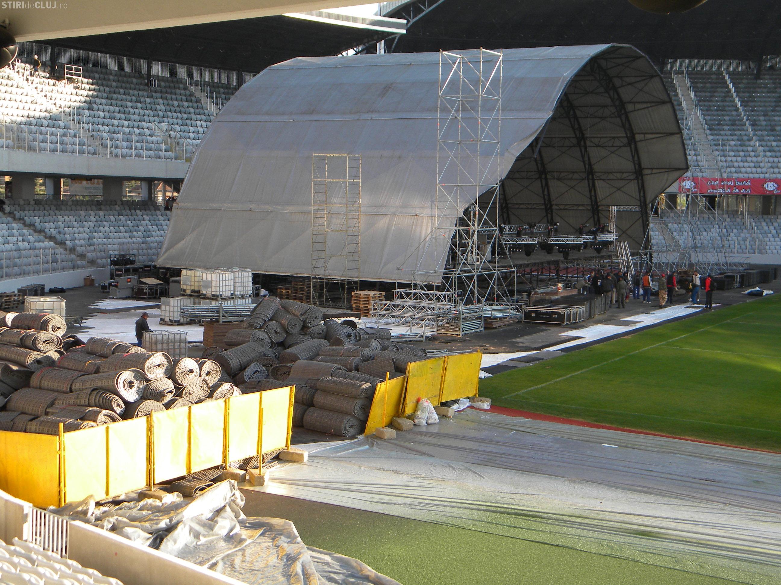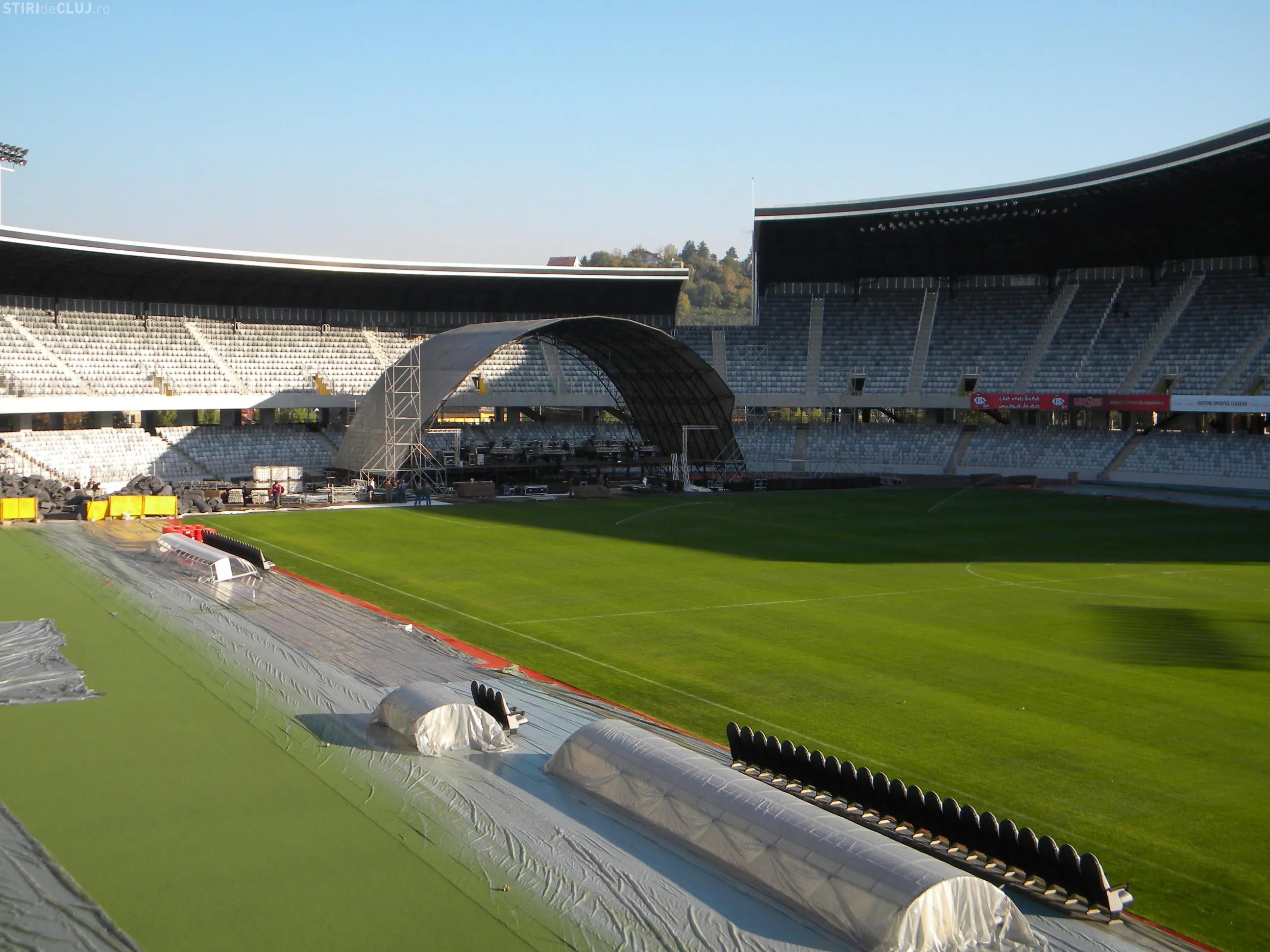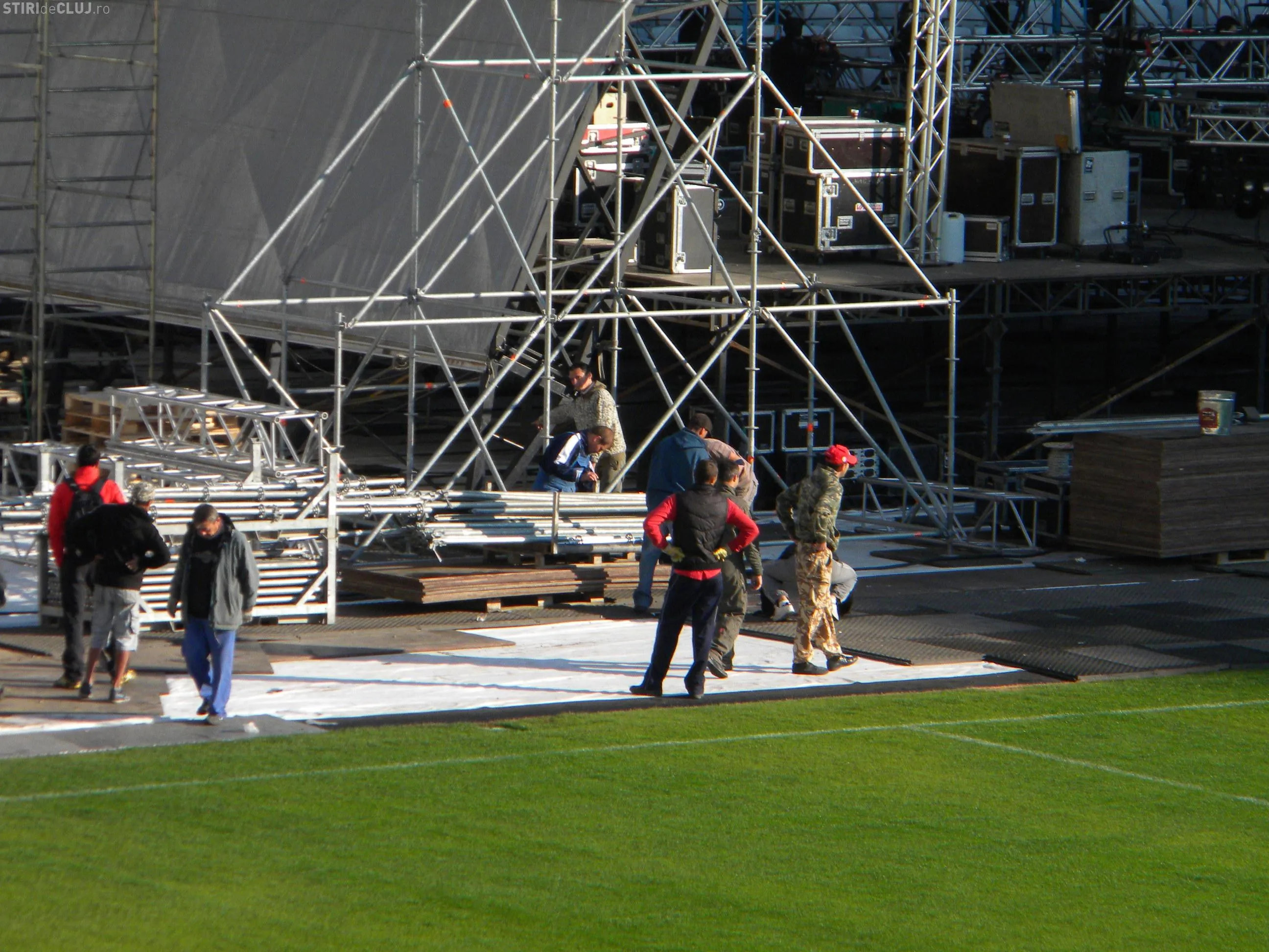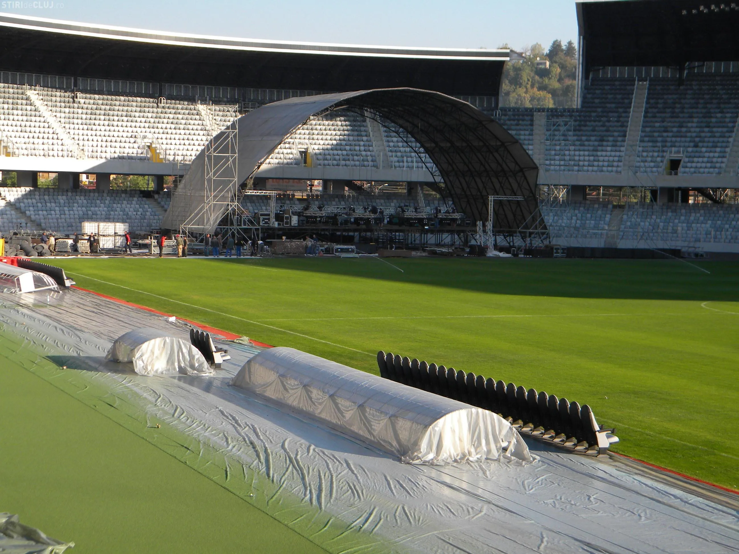 Muncitorii nu s-au apucat pana la ora 11.00 sa lucreze la montarea cover grass -ului care ar trebui sa protejeze gazonul de pe Cluj Arena.