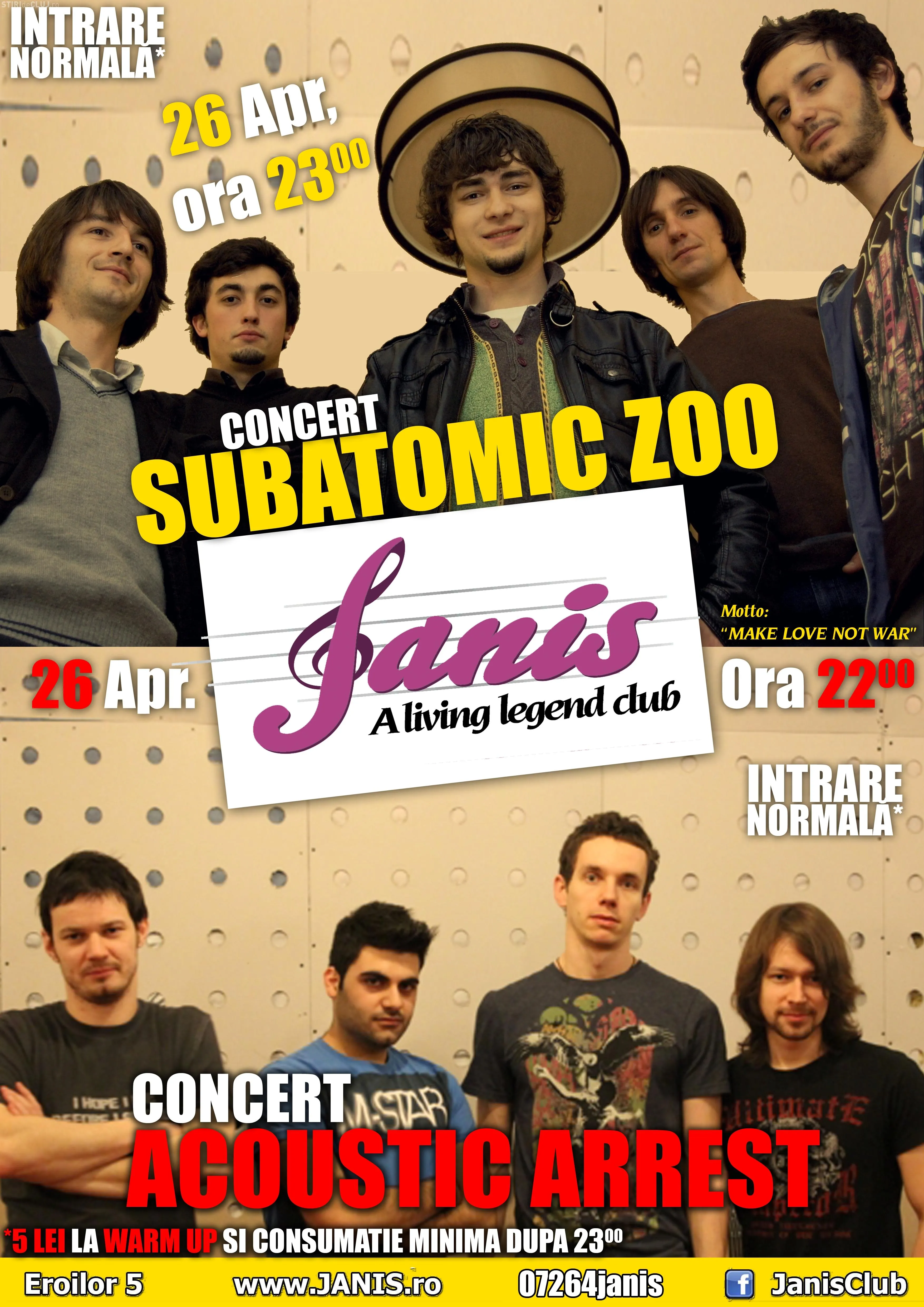 In aceasta seara, de la ora 22.00, Janis Club va asteapta la un concert in compania Acoustic Arrest si Subatomic Zoo. Acest concert deschide festivalul de la Suncuius, unde Janis asigura barul si o parte din muzica. Intrarea costa 5 lei(ca in orice seara normala de Warm-Up), iar dupa ora 23.00 acesta va consta doar intr-o consumatie minima obligatorie de 10 lei fetele si 15 lei baietii. Toti cei care vor fi prezenti la concert vor participa la Tombola unde se pun la bataie 10 invitatii pentru festivalul de la Suncuius. Iar toti participantii care merg la Suncuius vor primi un voucher pentru 3 BERI.