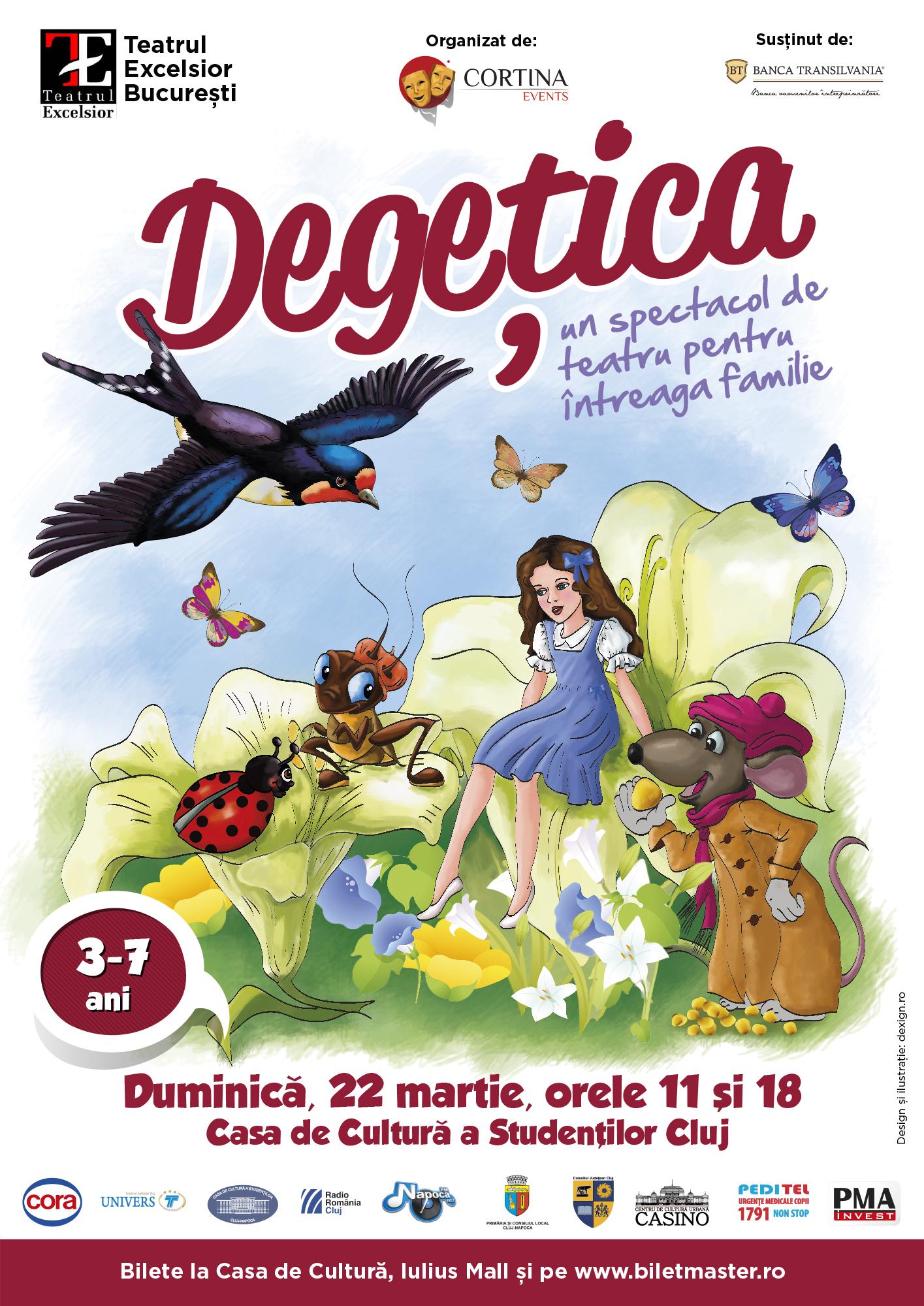 Spectacolul ”Degețica” va avea loc duminică, 22 martie 2015, la orele 11.00 si 18.00, la Casa de Cultură a Studenţilor din Cluj Napoca.