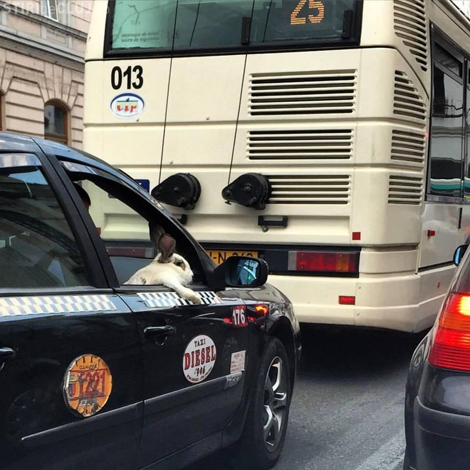 Și de asta Clujul e special! FOTO cu un iepure călătorind cu taxiul ca un BOSS