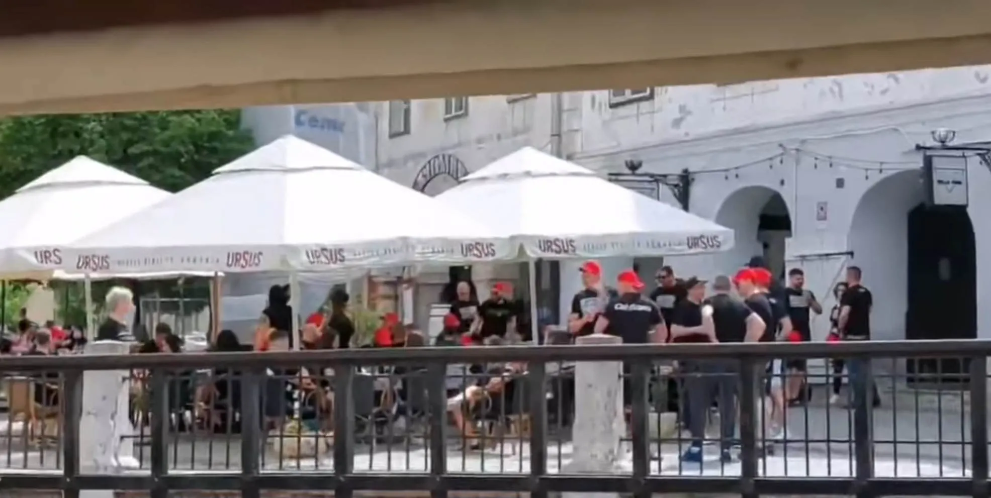 „Ne invadează huliganii acuma pe aicea, au început să dea și cu petarde, nu-i de ajuns că au început să urle ca bezmeticii. Nu știu cine-i întreține, nu știu ce se întâmplă aici, dar sigur nu e ce trebe”, spune bărbatul, în timp ce filmează suporterii care pur și simplu discutau la terase.