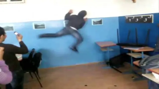 In imaginile filmate apare un tanar care alerga inversunat spre un perete de care incearca sa agate ca si Spiderman.Cel mai probabil filmuletul a fost realizat in pauza, cand elevii nu erau supravegheati.