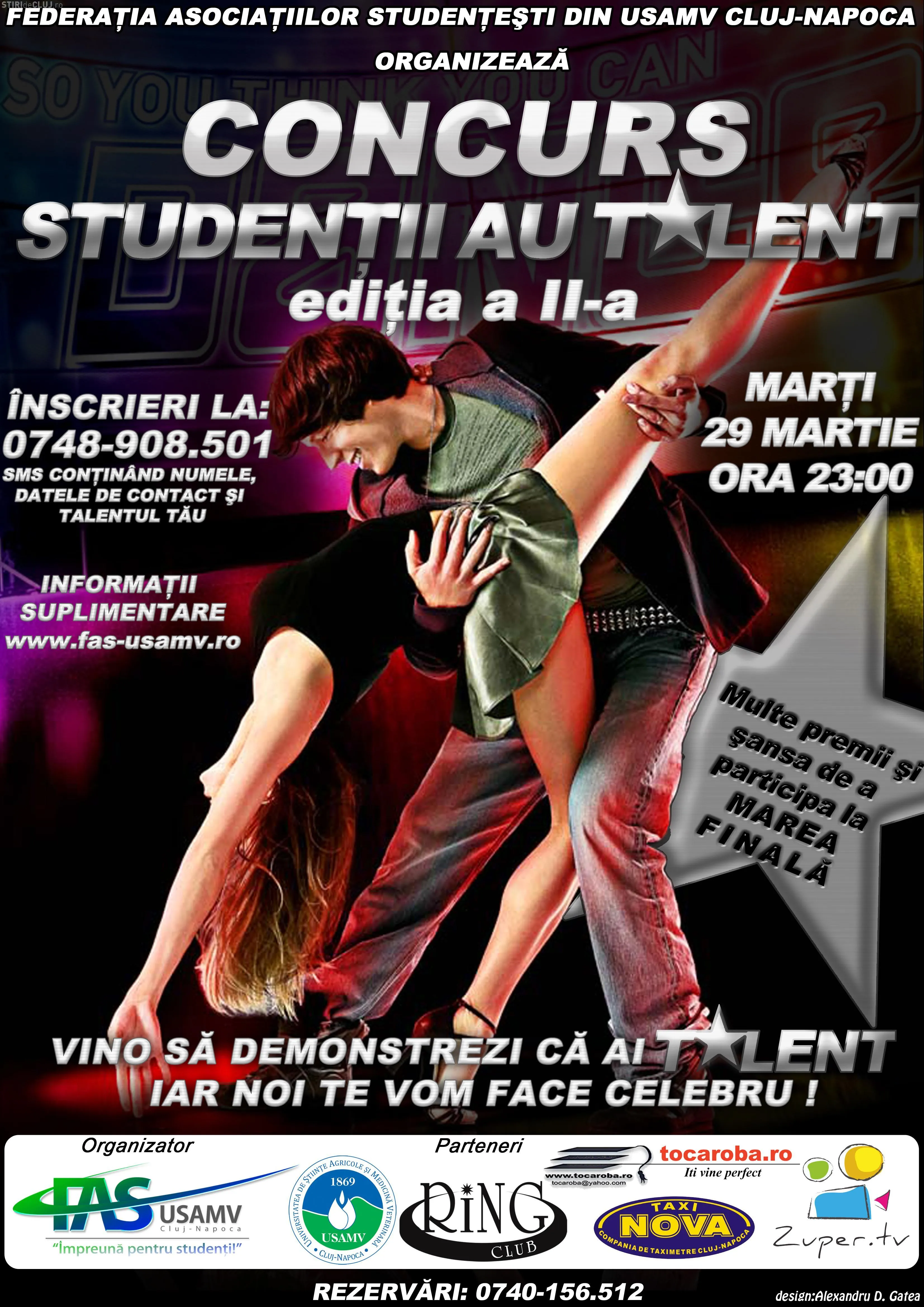"Intrucat cel mai tare concurs "ROMANII AU TALENT" a facut inconjurul tarii, l-am preluat, prelucrat si adaptat special pentru studenti, competitia avand loc pe RINGUL de dans. Federatia Asociatiilor Studentesti din USAMV Cluj-Napoca, invita toti studentii centrului universitar clujean, indiferent de talentul lor, fie ca danseaza, canta, cunoaste tainele magiei, este un actor bun sau orice alt talent deosebit detine, sa faca primul pas spre CELEBRITATE", anunta organizatorii concursului.