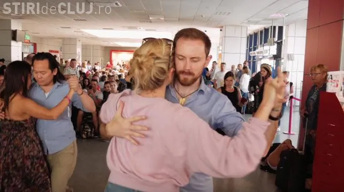 Turiștii care așteptau îmbarcarea în avion au fost luați prin surprindere de un eveniment imedit, un flashmob realizat de dansatorii care fuseseră la Cluj la Festivalul Internațional de Tango Argentinian din România.