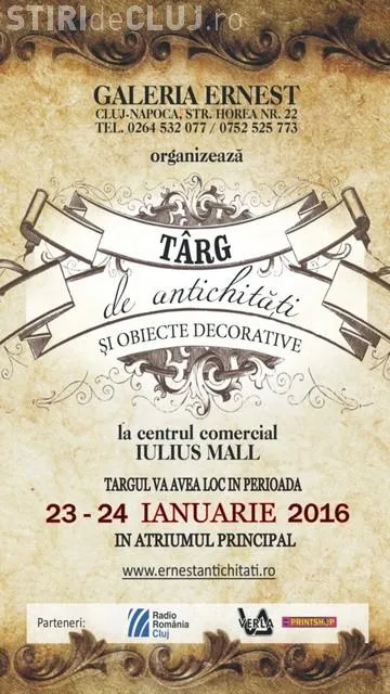 În acest week-end, cei care iubesc obiectele înnobilate de trecerea timpului sunt invitaţi în Atriumul Iulius Mall Cluj, la prima ediţie din acest an a Târgului de Antichităţi și Obiecte Decorative. De sâmbătă, 23 ianuarie 2016, aproximativ 50 de colecţionari din întreaga ţară îi aşteaptă pe clienţi cu numeroase piese care au poveşti ce aşteaptă a fi istorisite. Timp de două zile, pasionaţii vor putea achiziţiona, pentru colecţia personală sau pentru cei dragi, ceasuri, porţelanuri, numismatică, filatelie, mic mobilier, bijuterii, tablouri, accesorii, decoraţiuni şi multe altele.