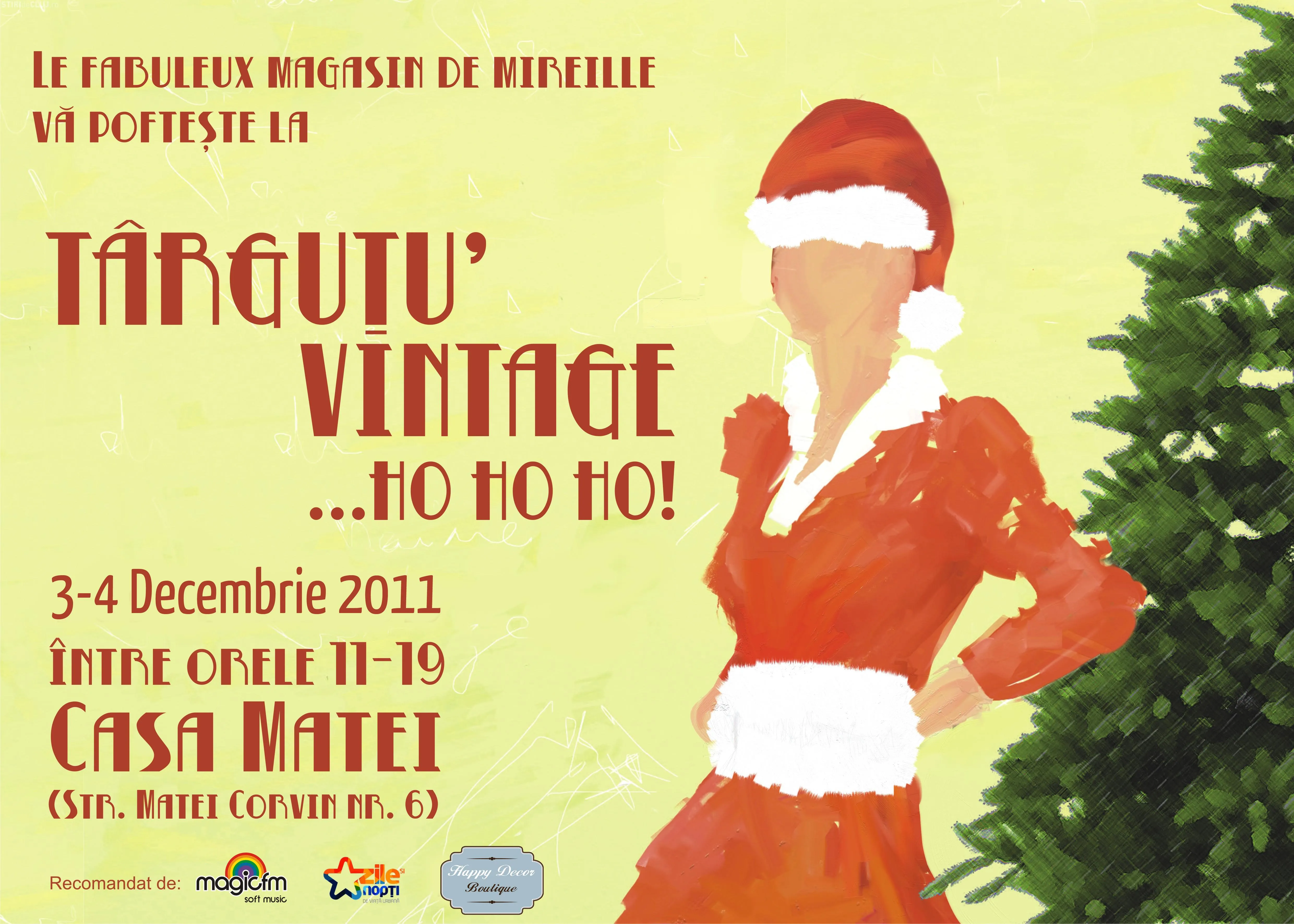 "In ajunul noptii de Mos Nicolae clujenii sunt invitati la shooping: mansoane si caciulite pentru un aer de vacanta retro, rochii vintage-glamour pentru seara de Reveillon, bijuterii, lucrusoare facute de manute iscusite, adica micile comori scoase la lumina din 'dulapurile' virtuale ale unora dintre cele mai hip & chic vintage hunter-ite din tara. Ocazie pentru clujenii atinsi de virusul vintage sa se molipseasca de-a binelea si sa descopere cele mai originale sugestii pentru traista lui Mos Nicolae", precizeaza organizatorii evenimentului intr-un comunicat de presa.