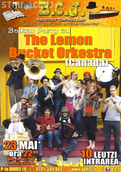 Biblioteca Centrala Janis (BCJ) gazduieste astazi, 23 mai, un concert al canadienilor The Lemon Bucket Orkestra. Te asteptam la ora 22:00 in BCJ unde cei 14 artisti originari din diferite tari, te vor incanta cu un super concert. Intrarea costa doar 10 leuti.