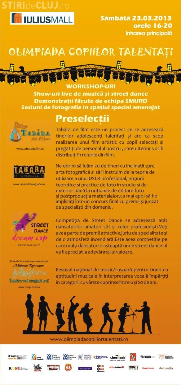 Sâmbătă, 23 martie, între orele 16.00 şi 20.00, prichindeii sunt aşteptaţi la parterul Iulius Mall pentru a participa la ”Olimpiada Copiilor Talentaţi”. Evenimentul îşi propune să acorde o şansă năzdrăvanilor cu abilităţi speciale prin organizarea a patru preselecţii simultane, în domenii artistice diferite. Micii actori au posibilitatea de a participa la ”Tabăra de film”, un proiect care are ca scop realizarea unei pelicule artistice cu adolescenţii selectaţi şi pregătiţi de personalul specializat. Tinerii cu înclinaţie spre arta fotografică se vor putea înscrie la ”Tabăra de fotografie”. Programul le va desluşi toate tainele fotografiei, de la utilizarea aparatului profesionist până la editarea imaginilor. La final, lucrările lor vor participa la un concurs cu premii”, precizează reprezentanții Iulius Mall Cluj.