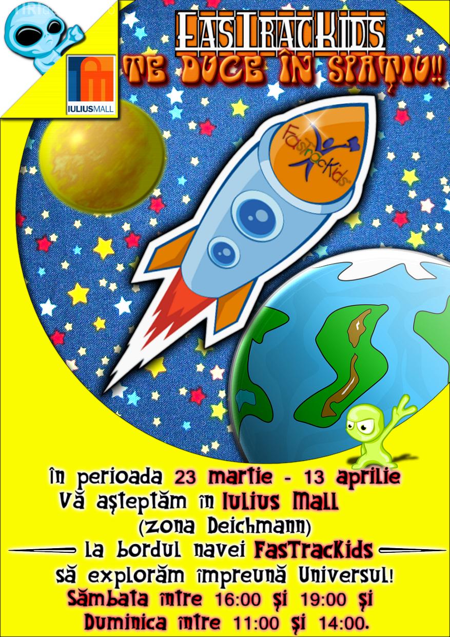 În perioada 23 martie - 13 aprilie, ştrengarii sunt invitaţi la ”Observatorul FasTracKids", de la parterul Iulius Mall. Sâmbăta, între orele 16.00 - 19.00, şi duminca, între orele 11.00 - 14.00, cei mici vor urca la bordul unei navete spaţiale virtuale. Alături de echipa FasTracKids, prichindeii vor explora universul şi vor afla mai multe despre planetele din sistemul nostru solar, constelaţii, comete, găuri negre şi multe alte taine ale cosmosului. În cadrul activităţilor creative din Staţia de Învăţare FasTracKids, cei mici vor construi mici galaxii şi costume de astronaut.