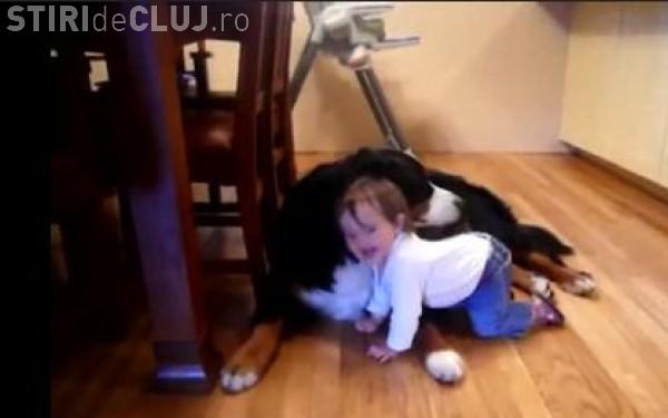 Un bebelus rade molipsitor in timp ce un caine il linge pe fata VIDEO