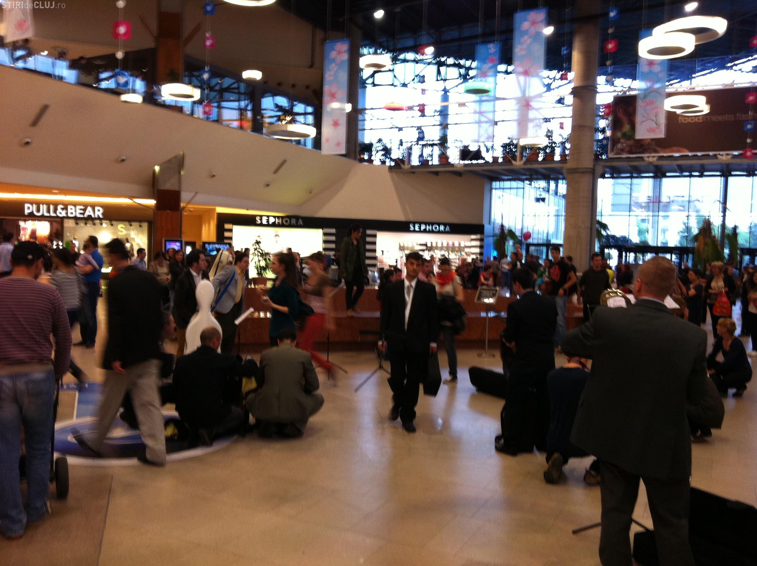 "Totul a durat cateva minute, iar apoi, ca si cand nu se stiau, au plecat. Si-au strans toti instrumentele si au plecat. Clujenii care se aflau in mall au aplaudat momentul, mai ales ca a fost uimitor", ne-a scris Mihai, un cititor Stiri de Cluj.