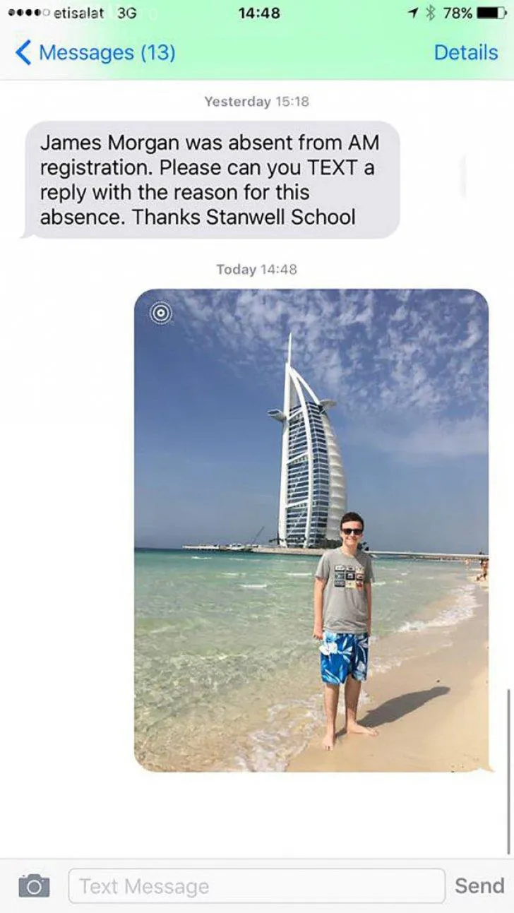Un părinte a fost întrebat de ce absentează băiatul lui și i-a trimis profesorului o fotografie cu fiul său în Dubai.