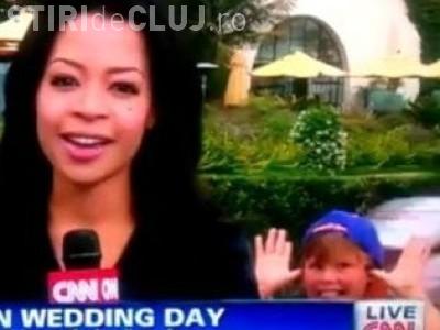 Baiatul si-a salutat la inceput cunoscutii si s-a strmbat in toate felurile. Kareen Wynter, reporterul CNN, nu si-a dat seama de ce se petrece in spate si a continuat relatarea, spre deliciul tuturor.