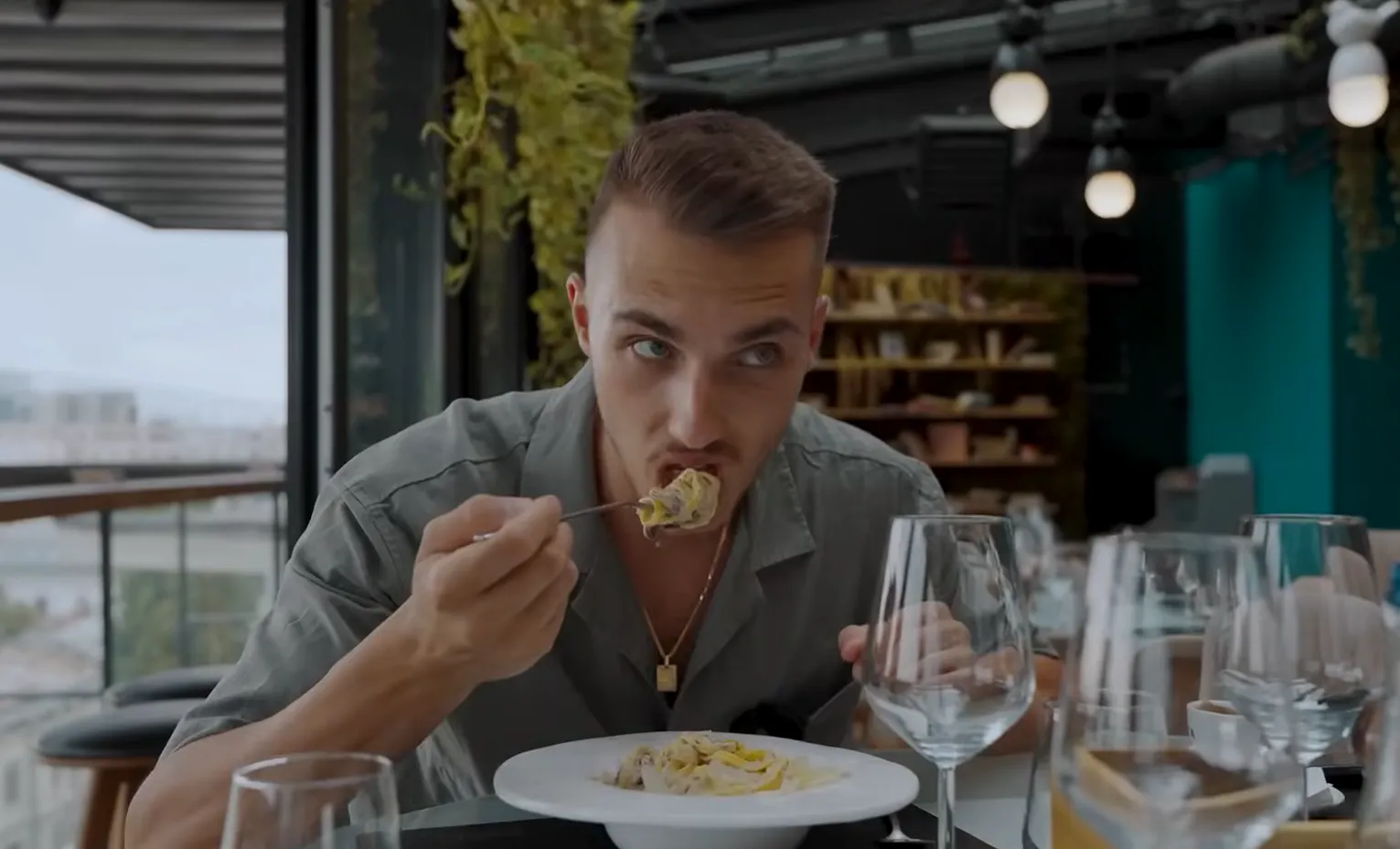 Matei a comandat o porție de paste cu trufe, un desert și două băuturi. „Am luat un singur fel principal de mâncare și un desert. O porție de paste cu trufe, preparat care ar trebui să fie foarte bun. Are în rețetă ciuperci, sos de hribi, parmezan și trufe. Miroase extraordinar de bine”, a spus vloggerul. După ce a gustat din preparat, Matei a fost extrem de impresionat de gustul acestora, acordându-le o notă de 9,62, cea mai mare pe care a dat-o vreodată unui preparat. „Da, bro, se înscrie bine. Nu sunt paste din comerț, par să fie făcute în casă. Bucăți de parmezan cât cuprinde. Nu e nevoie să iau din ele mai mult. Nota este de 9,62 – pentru gust. Este cea mai mare notă pe care am dat-o până acum. Îmi place că sunt bucăți cu totul de hribi, trufe și parmezan. Top! Pastele sunt absolut geniale. Servirea este foarte bună, iar abordarea ospătarilor este ca la carte”, a declarat Matei.